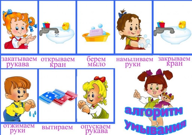 С 1,6 лет учите малыша подставлять руки под струю воды, потирать ими. С двух лет ребенок должен мыть руки с мылом, вытирать их полотенцем. Учите ребенка закатывать рукава, круговыми движениями мыть руки, лицо, умывать «всё», а не только нос. Умывание сопровождайте рассказыванием потешек (Водичка, водичка…), стихов. Исключайте возможность неприятных ощущений во время умывания – вода должна быть комнатной температуры. Вытираясь полотенцем, ребенок часто спешит и делает это небрежно. Терпеливо добивайтесь, чтобы он насухо вытирал лицо и руки. У ребенка должно быть личное полотенце на уровне его роста (вешать должен сам).